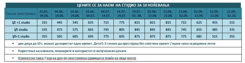 Такса за престој, во висина од 2 еврa по сместувачка единица на ден се плаќа на лице место, на претставникот или сопствениците на објектот и не подлежи на попусти!