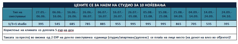 Такса за престој, во висина од 2 еврa по сместувачка единица на ден се плаќа на лице место, на претставникот или сопствениците на објектот и не подлежи на попусти!