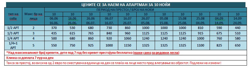 Такса за престој, во висина од 2 еврa по сместувачка единица на ден се плаќа на лице место пред влегување во објектот. Подлежи на измени!