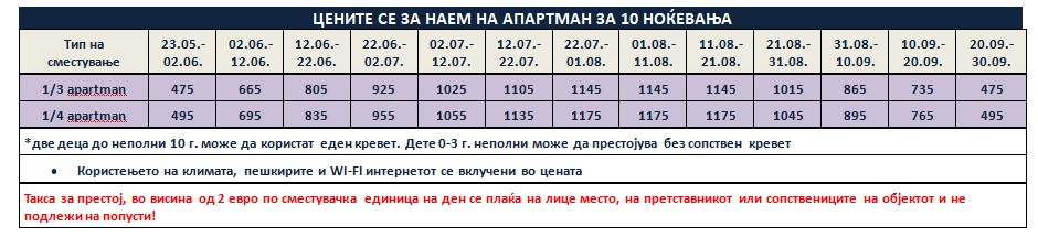 Такса за престој, во висина од 2 еврa по сместувачка единица на ден се плаќа на лице место, на претставникот или сопствениците на објектот и не подлежи на попусти!