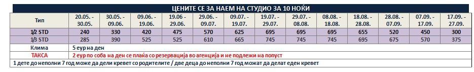 Такса за престој, во висина од 2 еврa по сместувачка единица на ден се плаќа во агенција со резервација и не подлежи на попусти!