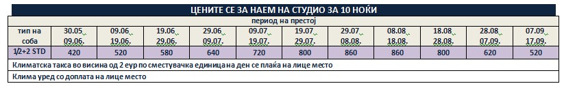 • На дополнителните услуги (доплата за клима, полупансион и сл.), наведени во ценовникот, не се пресметуваат попусти.