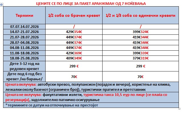 ПРОМО ЦЕНИ ЗА ЛЕТО 2026 ЗА РЕЗЕРВАЦИЈА СО 50% АВАНС ДО 30.04.2026, А ОСТАНАТИОТ ДЕЛ НАЈДОЦНА ДО 20.06.2026