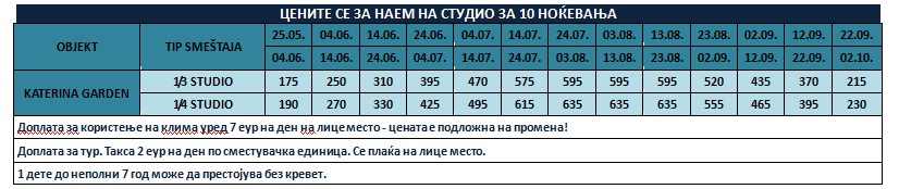 KATERINA GARDEN House се наоѓа во централниот дел на Лептокарија, во мирен дел, на околу 70 м од плажата и околу 100м од центарот, веднаш спроти хотелот Dafni plus. Располага убав двор со летниковец (без скара!) и со комфорни трикреветни и четирикреветни студија, на приземје, секое има по 2 тераси, едната со поглед кон дворот, другата на мирната улица. Сите сместувачки единици имаат основно опремена чајна кујна, со врата одвоена од делот каде се креветите, купатило, ТВ, 2 тераси со гарнитура за седење и клима уред чие користење се доплаќа на лице место. Промената на постелнината е на половина од смената. Во сместувачките единици нема пешкири. Има бежичен WI–FI интернет почнувајќи од 01.06., за чија брзина агенцијата не може да гарантира. Објектот нема сопствен паркинг.
