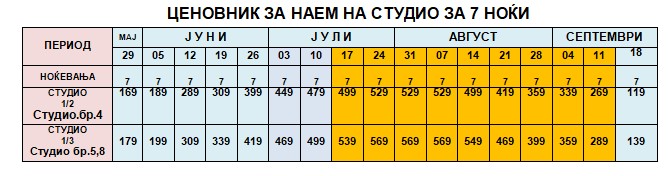– Туристичка такса се плаќа во АГЕНЦИЈА 2€ од ноќ за студијата и апартманите (доколку дојде до промена на туристичката такса од страна на грчките власти, цената ќе биде променета).