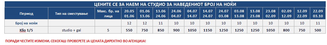 -Во објектите каде што користење на клима уредот е со доплата на лице место, цената се движи од 6-10 еур на ден по уред. Истатата е променлива и не предмет на договор помеѓу агенцијата и сопственикот.