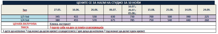 Такса за престој, во висина од 2 еврa по сместувачка единица на ден се плаќа во агенција со резервација и не подлежи на попусти!