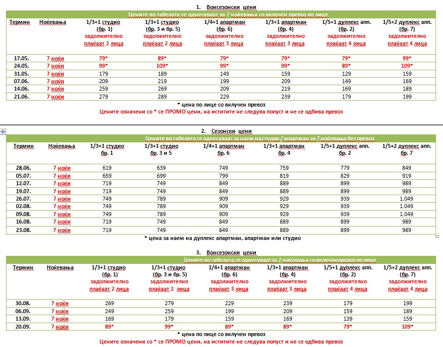 • ЦЕНИТЕ ВО ТАБЕЛА БР.2 – СЕЗОНСКИ СЕ ДАДЕНИ ЗА НАЕМ НА СТУДИО/АПАРТМАН/ДУПЛЕКС ЗА 7 НОЌЕВАЊА, според бројот на кревети во секоја соба, без вклучен превоз, а истиот се доплаќа: