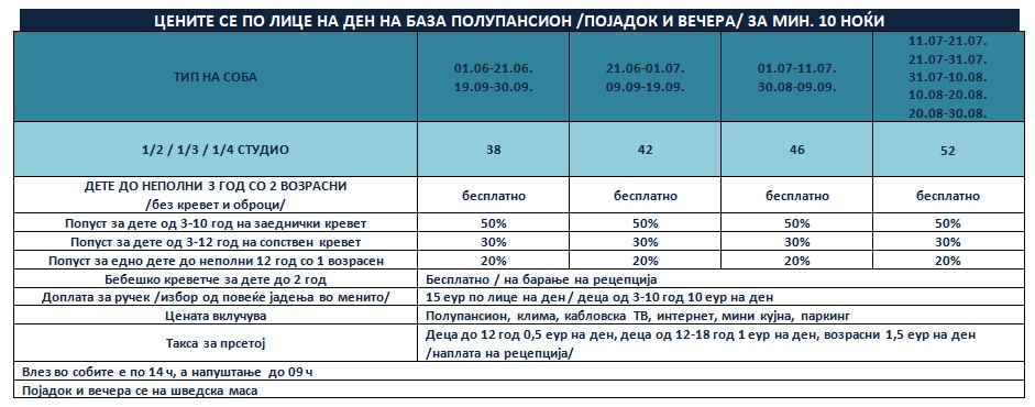 ЦЕНИТЕ ЗА ЛЕТО 2026 СЕ СО ПРЕСМЕТАН ПОПУСТ ЗА РЕЗЕРВАЦИЈА ДО 31.01.2026