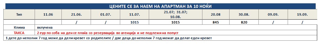 Такса за престој, во висина од 2 еврa по сместувачка единица на ден се плаќа во агенција со резервација и не подлежи на попусти!