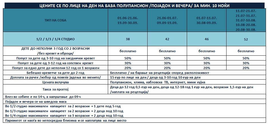 ЦЕНИТЕ ЗА ЛЕТО 2026 СЕ СО ПРЕСМЕТАН ПОПУСТ ЗА РЕЗЕРВАЦИЈА ДО 31.01.2026
