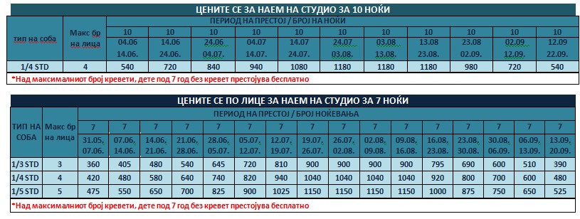 • Организаторот не гарантира кат, поглед, број на сместувачката единица, доколку тоа не е наведено во ценовникот.