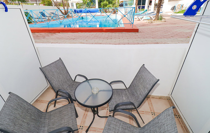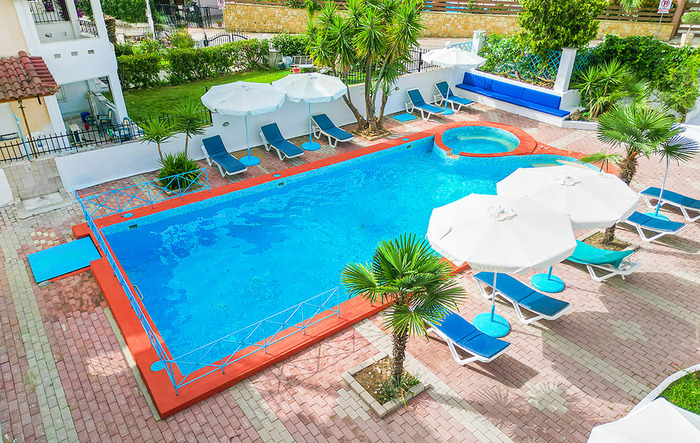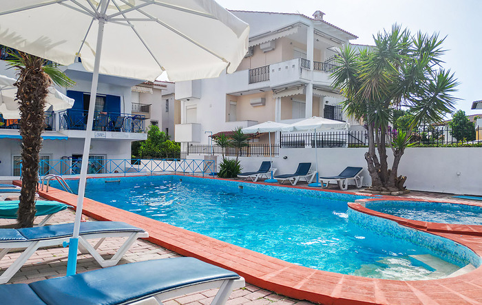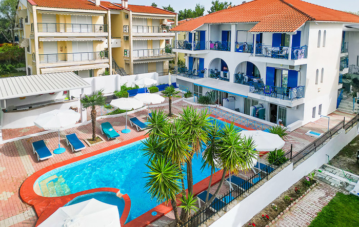 Aparthotel Macedonia Sky се наоѓа во мирниот дел на Ханиоти, оддалечен околу 300 м од плажата и 450 м од центарот на Ханиоти. Има убав двор со базен, лежалки гарнитури за седење. Студијата се во ниско приземје и на прв и втор кат. Наменети се за сместување на 4 лица. Секое студио има купатило, фен, тераса, опремен кујнски дел, ТВ, клима уред чие користење е вклучено во цената, WiFi, за чија брзина агенцијата не може да гарантира. Сите сместувачки единици од понудата се реновирани 2018та година (нов намештај и кујни).