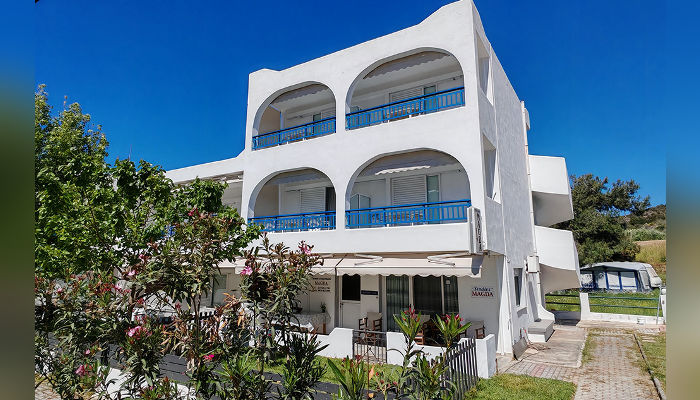 MAGDA – Куќата се наоѓа карши куќата Мариа, на само 80 m од плажата, во најубавиот дел на Каламици. Сместувачките единици се наоѓаат на приземје, на 1. и на 2. кат и сите имаат SAT TV, сигнал за бежичен интернет, за чија брзина агенцијата не може да гарантира и клима уред, чие користење е вклучено во цената. Студијата се опремени се со мал фрижидер, решо, пешкири, комарници, тераси со тенди. Во 2+2 студијата покрај француски кревет има и кревети на кат. Во апартманите има средно голем фрижидер и мал шпорет, клима во кујна, пешкири, комарници, тераси со тенди. Куќата има убаво уреден тревнат двор со заедничка скара, како и неколку паркинг места за гостите на куќата.