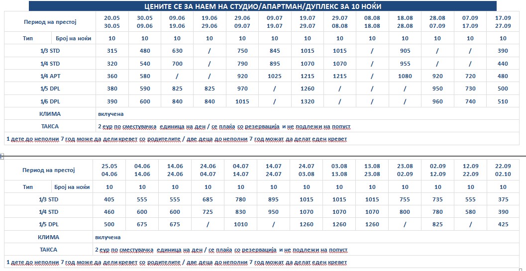 Такса за престој, во висина од 2 еврa по сместувачка единица на ден се плаќа во агенција со резервација и не подлежи на попусти!