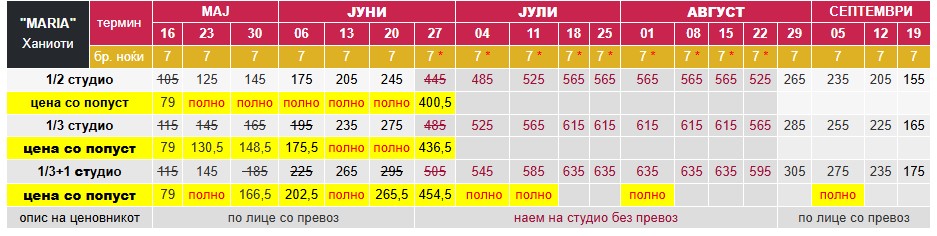 – Цените за 7 ноќи/8 дена со *, се дадени за наем на цело студио без вклучен превоз;