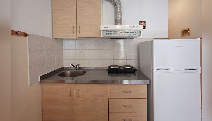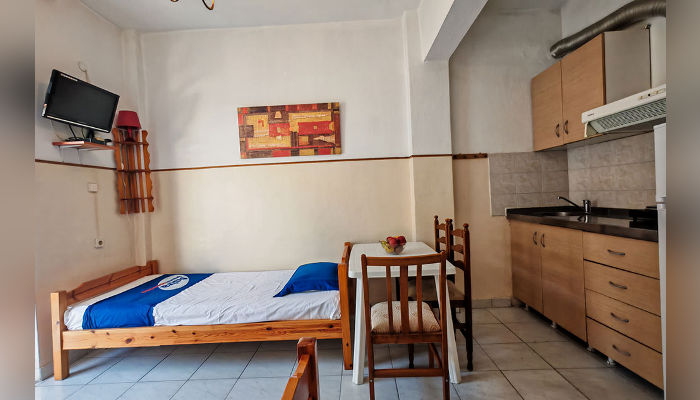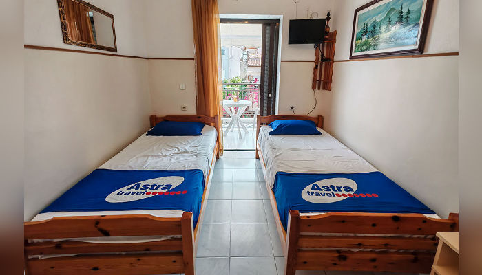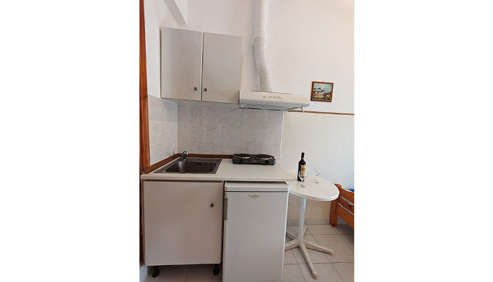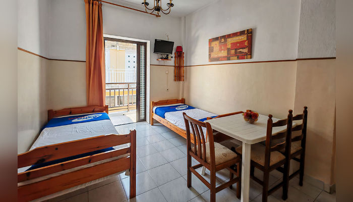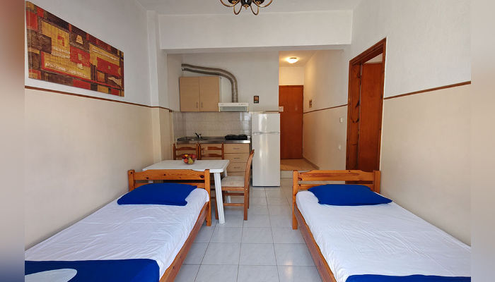 Двокреветно студио има два единечни легла, кои не можат да се спојат, мал фрижидер, решо, купатило со озидана туш-када, мала тераса со тенда и поглед на улица.