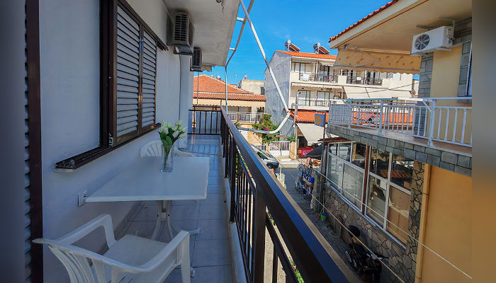 Четворокреветен апартман има два единечни легла во спална соба и два во кујна, голем фрижидер, решо, средно голема тераса со тенда и поглед на улица.