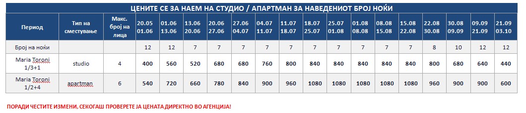 MARIA – Куќата се наоѓа на 450 метри од морето – пешки. Доколку сакате со возило до плажа, оддалеченоста е под 1 км. Студиo и апартманот се наоѓаат на приземје во мирниот дел на Торони. Сите сместувачки единици имаат ТВ, кујни со садови и прибор, мал фрижидер и решо, клима уред, чие користење е вклучено во цената, како и бежичен интернет, за чија брзина агенцијата не може да гарантира, комарници и пешкири, како и големи трем тераси опремени со маса и столови. Објектот поседува тревнат двор со скара и паркинг простор.