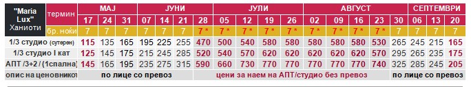 – Цените за 7 ноќи/8 дена со *, се дадени за наем на цело студио/апартман без вклучен превоз;