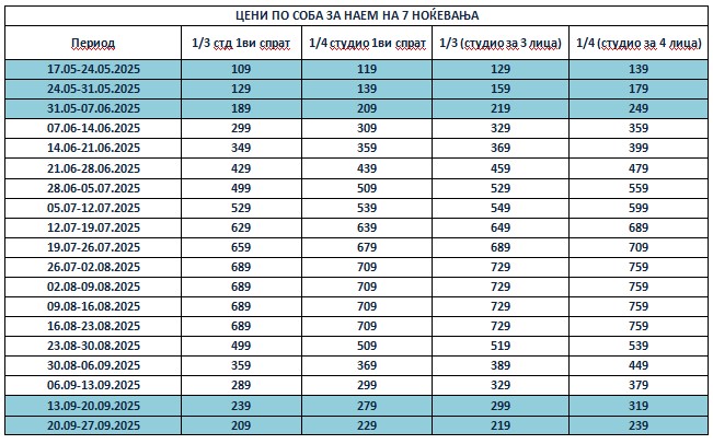 • Цените се однесуваат на наем на студио за 7 ноќевања (без превоз).