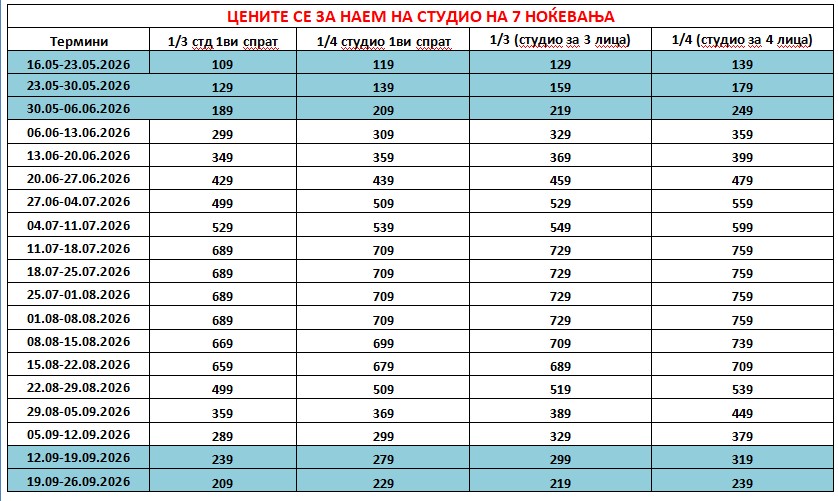 • Цените се за наем на студио за 7 ноќевања (без превоз).