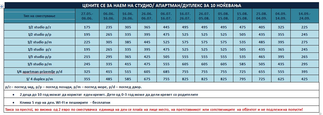 Такса за престој, во висина од 2 еврa по сместувачка единица на ден се плаќа на лице место, на претставникот или сопствениците на објектот и не подлежи на попусти!