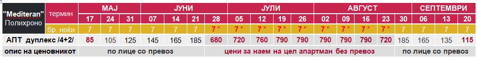 – Цените за 7 ноќи/8 дена (со *), се дадени за наем на цел апартман без вклучен превоз;