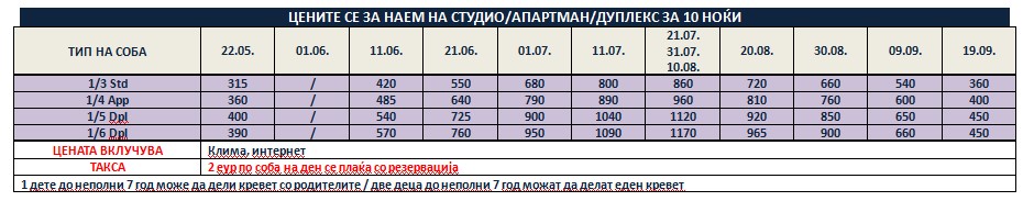 Такса за престој, во висина од 2 еврa по сместувачка единица на ден се плаќа во агенција со резервација и не подлежи на попусти!