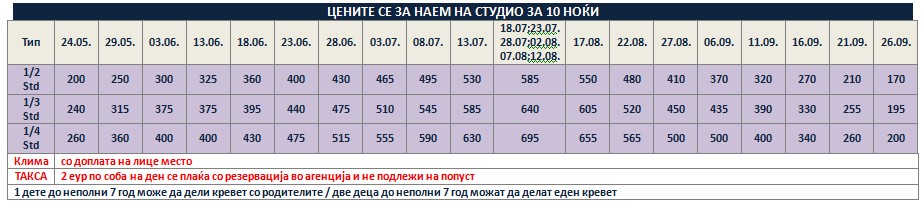 Такса за престој, во висина од 2 еврa по сместувачка единица на ден се плаќа во агенција со резервација и не подлежи на попусти!