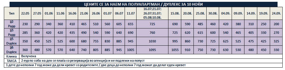 Такса за престој, во висина од 2 евро по сместувачка единица на ден се плаќа во агенција со резервација и не подлежи на попусти!