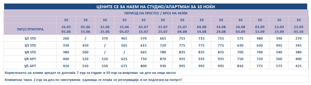 Такса за престој, во висина од 2 еврa по сместувачка единица на ден се плаќа во агенција со резервација и не подлежи на попусти!