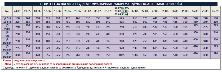 Такса за престој, во висина од 2 еврa по сместувачка единица на ден се плаќа во агенција со резервација и не подлежи на попусти!