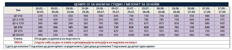 Такса за престој, во висина од 2 еврa по сместувачка единица на ден се плаќа во агенција со резервација и не подлежи на попусти!