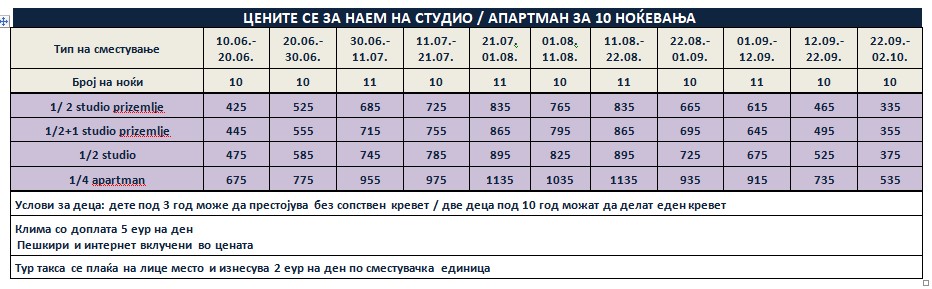 Такса за престој, во висина од 2 еврa по сместувачка единица на ден се плаќа на лице место, на претставникот или сопствениците на објектот и не подлежи на попусти!