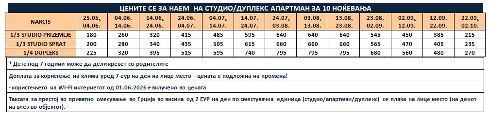 Narcis, квалитетен објект со добри домаќини. Се наоѓа на околу 110 метри од плажа, во центарот на местото, но во мирниот дел. Во близина се бројните продавници, таверни, кафетерии, сувенирници и сите останати туристички содржини. Располага со двокреветни и трокреветни студија, како и со четворокреветни дуплекс апартмани кои се наоѓаат на приземје и втор кат (ценовно се одделени приземје и кат, но по квалитетот на опременоста се идентични). Студијата на приземје имаат оградена тераса. Куќата има лифт и рецепција. Сите сместувачки капацитети имаат основно опремена кујна (садови, фрижидер, решо, прибор за јадење), купатило, тераса со гарнитура за седење, ТВ и клима уред, чие користење е со доплата на лице место (7 евра на ден – цената е подложна на измена), како и бежичен интернет, за чија брзина агенцијата не може да гарантира. Објектот не нуди пешкири, а замена на постелнината е на половина од престојот. Одржување на хигијената во сместувачките единици за време на престојот, ја вршат самите гости. Куќа нема свој паркинг.