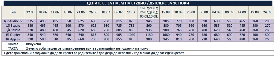 Такса за престој, во висина од 2 еврa по сместувачка единица на ден се плаќа во агенција со резервација и не подлежи на попусти!
