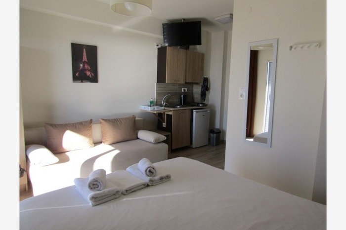 Nikolaidis New  се наоѓа на самата плажа во Nea Plagia, во делот кон Nea Flogita, на 100-тина метри од  куќите Адонис и Тасос 1 во Неа Флогита. Сите сместувачки единици се комплетно реновирани, освен четирикреветниот апартман во спуштено приземје(ЅР).  Во понуда се 1/3 студија со и без поглед на море, како и 1/4 дуплекс апартмани без поглед на море. Сите сместувачки единици има основно опремена кујна со садови и прибор сразмерно со бројот на кревети, купатило, тераса, сигнал за бежичен интернет, за чија брзина и проток агенцијата не може да гарантира , TV и клима уред, чие користење е вклучено во цената. Менување на постелнината и пешкирите е еднаш во текот на престојот.