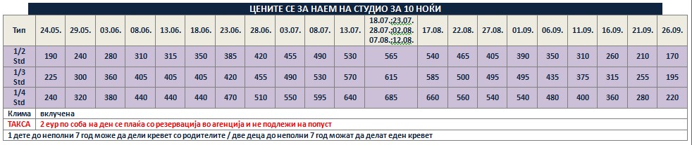 Такса за престој, во висина од 2 еврa по сместувачка единица на ден се плаќа во агенција со резервација и не подлежи на попусти!