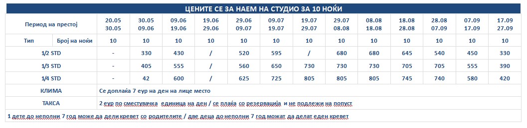 Такса за престој, во висина од 2 еврa по сместувачка единица на ден се плаќа во агенција со резервација и не подлежи на попусти!