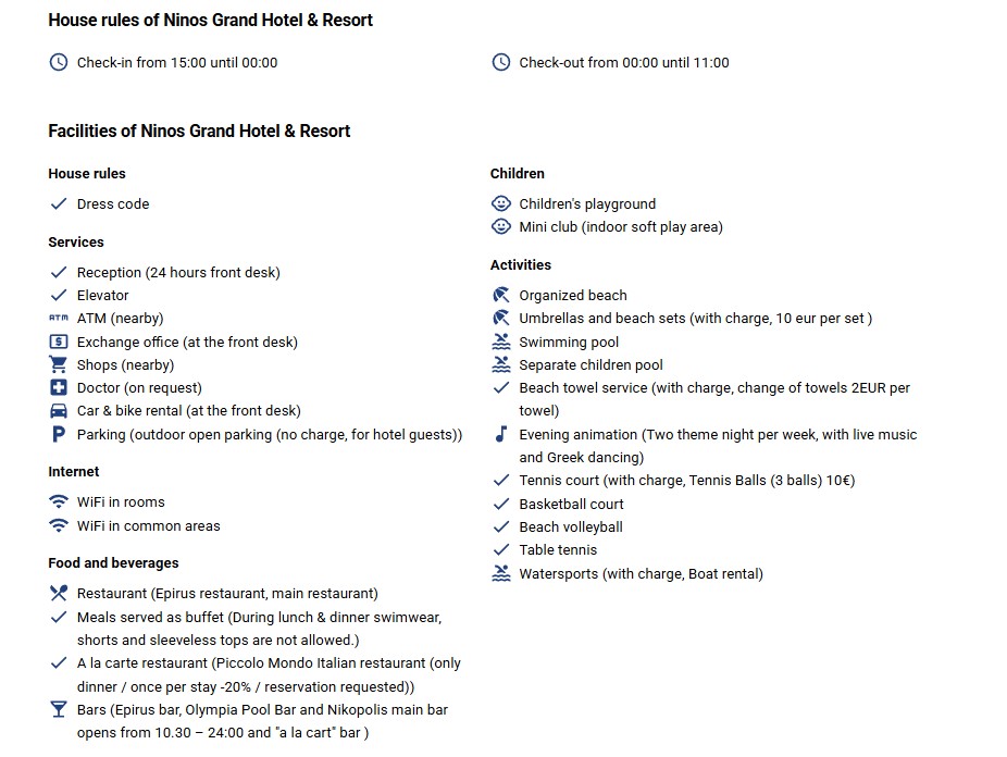 Moreover, just 7 km away, Ancient Cassope awaits exploration, treating visitors to mesmerizing vistas over the Ambracian Gulf and the Ionian Sea. At Ninos Grand Beach Hotel & Resort, guests are invited to revel in both luxury and the captivating allure of Greece’s landscapes while immersing themselves in a blend of modern comfort and ancient marvels. During lunch & dinner, a summer chic dress code applies to all restaurants. Swimwear, shorts and sleeveless tops are not allowed.