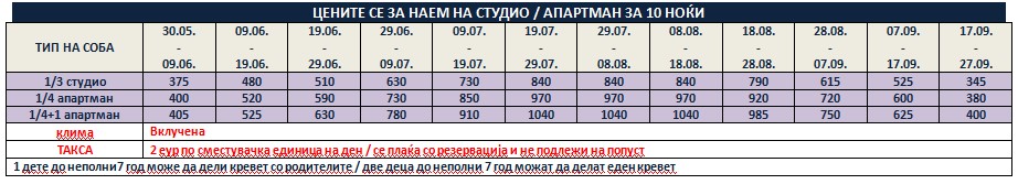 Такса за престој, во висина од 2 еврa по сместувачка единица на ден се плаќа во агенција со резервација и не подлежи на попусти!