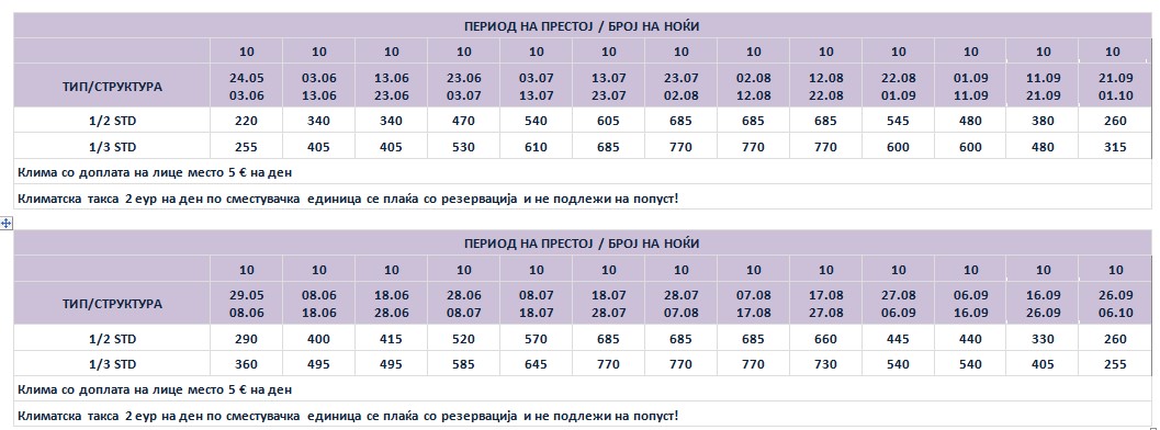 Такса за престој, во висина од 2 еврa по сместувачка единица на ден се плаќа во агенција со резервација и не подлежи на попусти!