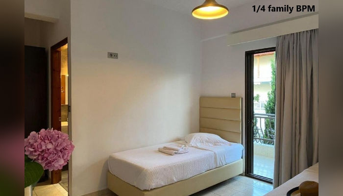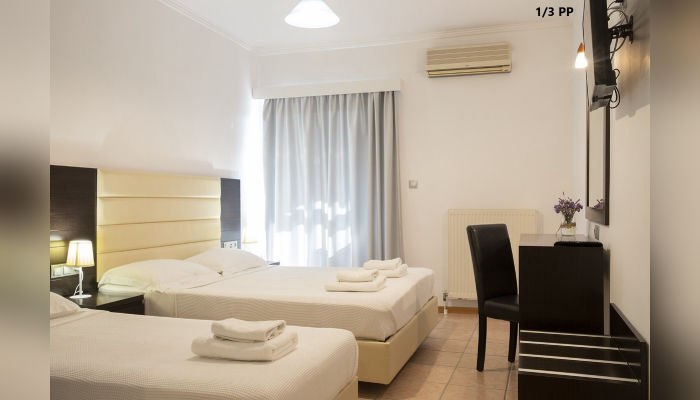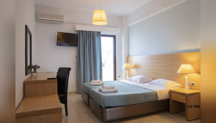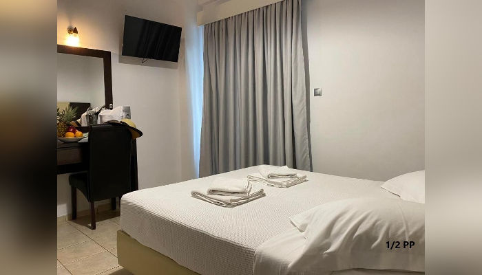 Во понуда се двокреветни и трокреветни соби со брачен и единечен кревет, тераси со директен или страничен поглед на море, како и со поглед на планина, на прв и втор кат. Четворокреветна фамилијарна соба во една просторија има два единечни кревети, а во друга брачен, тоалет, голема аголна тераса на која се излегува од двете соби, со страничен поглед на море е и се наоѓа на втор кат.