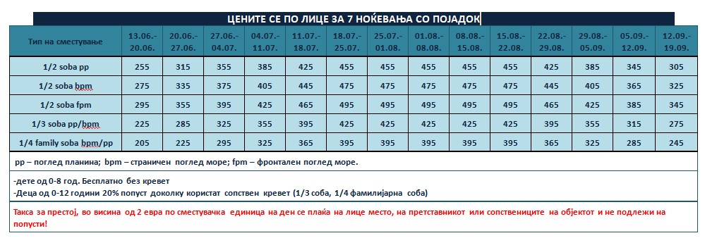 Такса за престој, во висина од 2 евро по сместувачка единица на ден се плаќа на лице место, на претставникот или сопствениците на објектот и не подлежи на попусти!