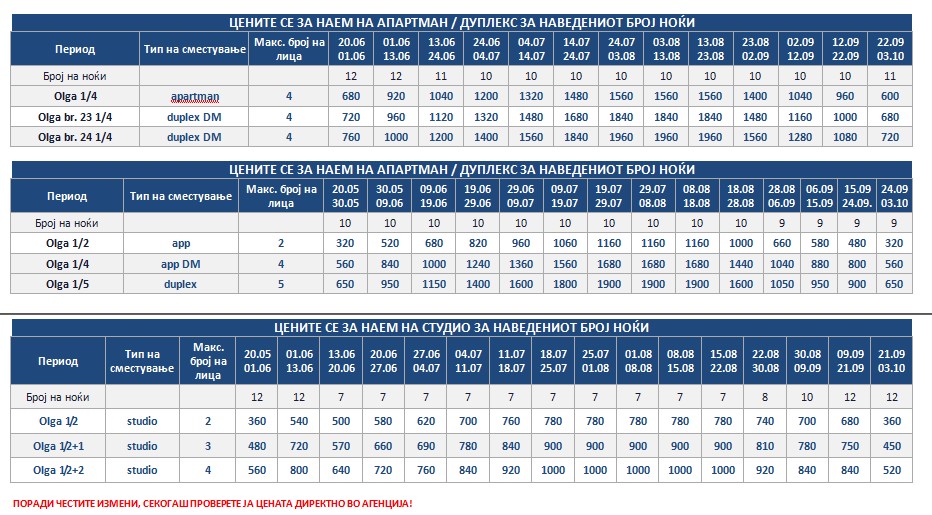 OLGA – Се наоѓа на најубавиот дел на плажата. Студијата и апартманите се во главната зграда, на приземје и прв кат. Студијата се со делумно одделена кујна, a во спалниот дел има два класични кревети и една или две фотељи на развлекување. Дел од апартманите и дуплексите имаат балкон со поглед на море. Сите имаат комарници, SAT TV, сигнал за бежичен интернет, за чија брзина и проток агенцијата не може да гарантира и клима вклучена во цената. Користењето на пешкири е со депозит од 10 ЕУР. Замена на постелнината и чистење на половина од смената.