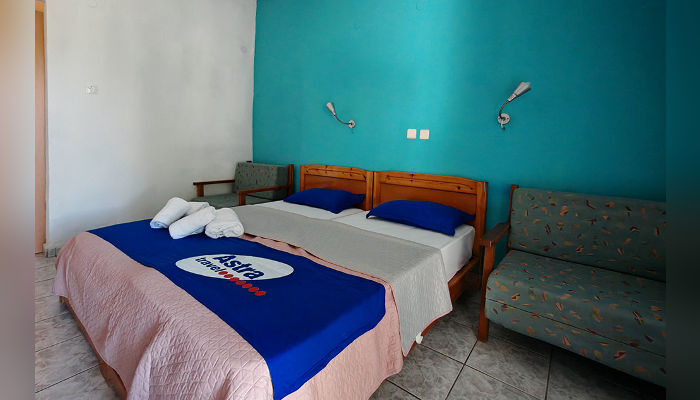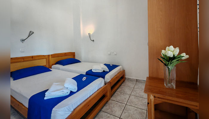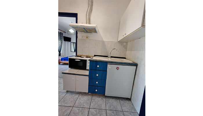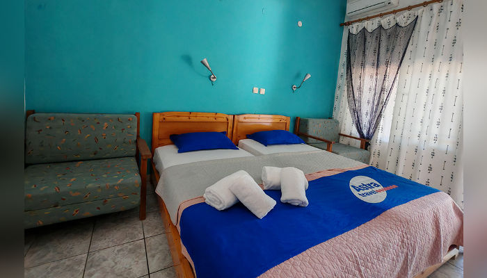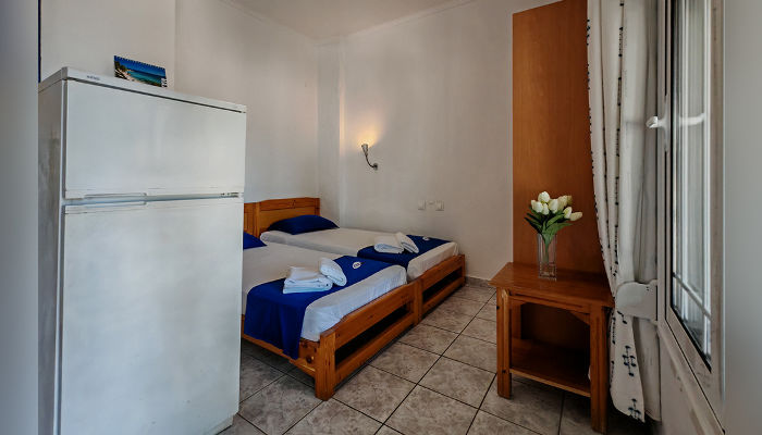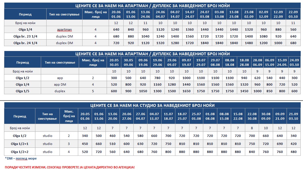 OLGAСе наоѓа на најубавиот дел на плажата. Студијата и апартманите се во главната зграда, на приземје и прв кат. Студијата се со делумно одделена кујна, a во спалниот дел има два класични кревети и една или две фотељи на развлекување. Дел од апартманите и дуплексите имаат балкон со поглед на море. Сите имаат комарници, SAT TV, сигнал за бежичен интернет, за чија брзина и проток агенцијата не може да гарантира и клима вклучена во цената. Користењето на пешкири е со депозит од 10 ЕУР. Замена на постелнината и чистење на половина од смената.