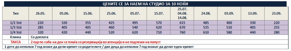 Такса за престој, во висина од 2 еврa по сместувачка единица на ден се плаќа во агенција со резервација и не подлежи на попусти!