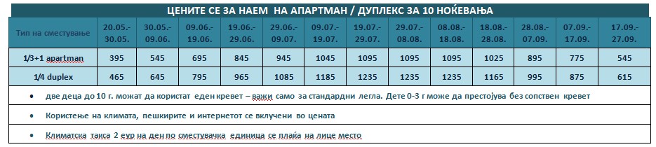 Такса за престој, во висина од 2 еврa по сместувачка единица на ден се плаќа на лице место, на претставникот или сопствениците на објектот и не подлежи на попусти!