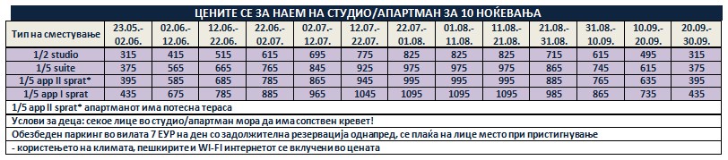 1/5 apartman – во една просторија чајна кујна и еден брачен кревет, а во втората просторија брачен кревет или кревет на развлекување и чајна кујна.